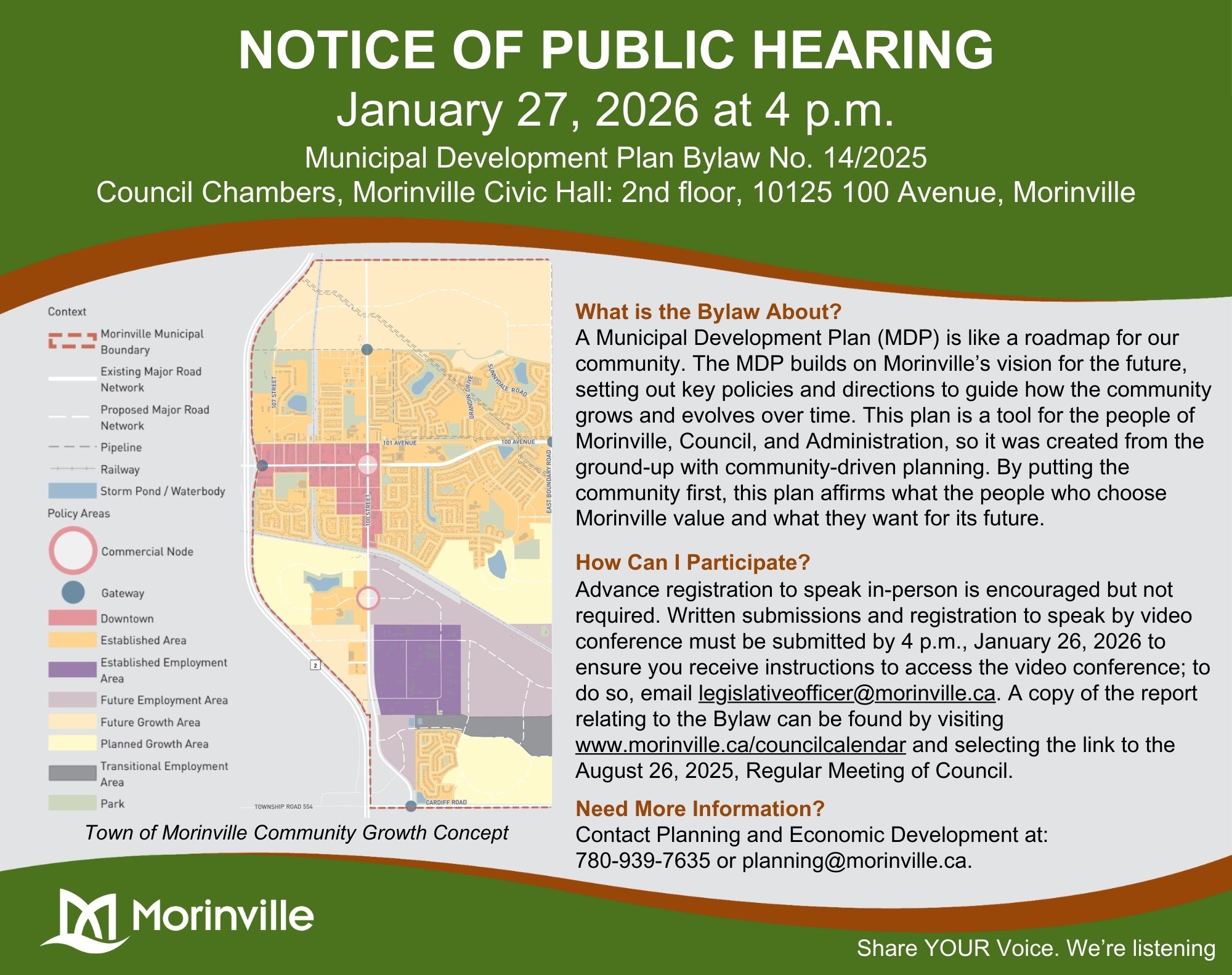 Advance registration to speak in-person is encouraged but not required. Written submissions and registration to speak by video conference must be submitted by 4 p.m., January 26, 2026 to ensure you receive instructions to access the video conference; to do so, email legislativeofficer@morinville.ca. A copy of the report relating to the Bylaw can be found by visiting www.morinville.ca/councilcalendar and selecting the link to the August 26, 2025, Regular Meeting of Council.