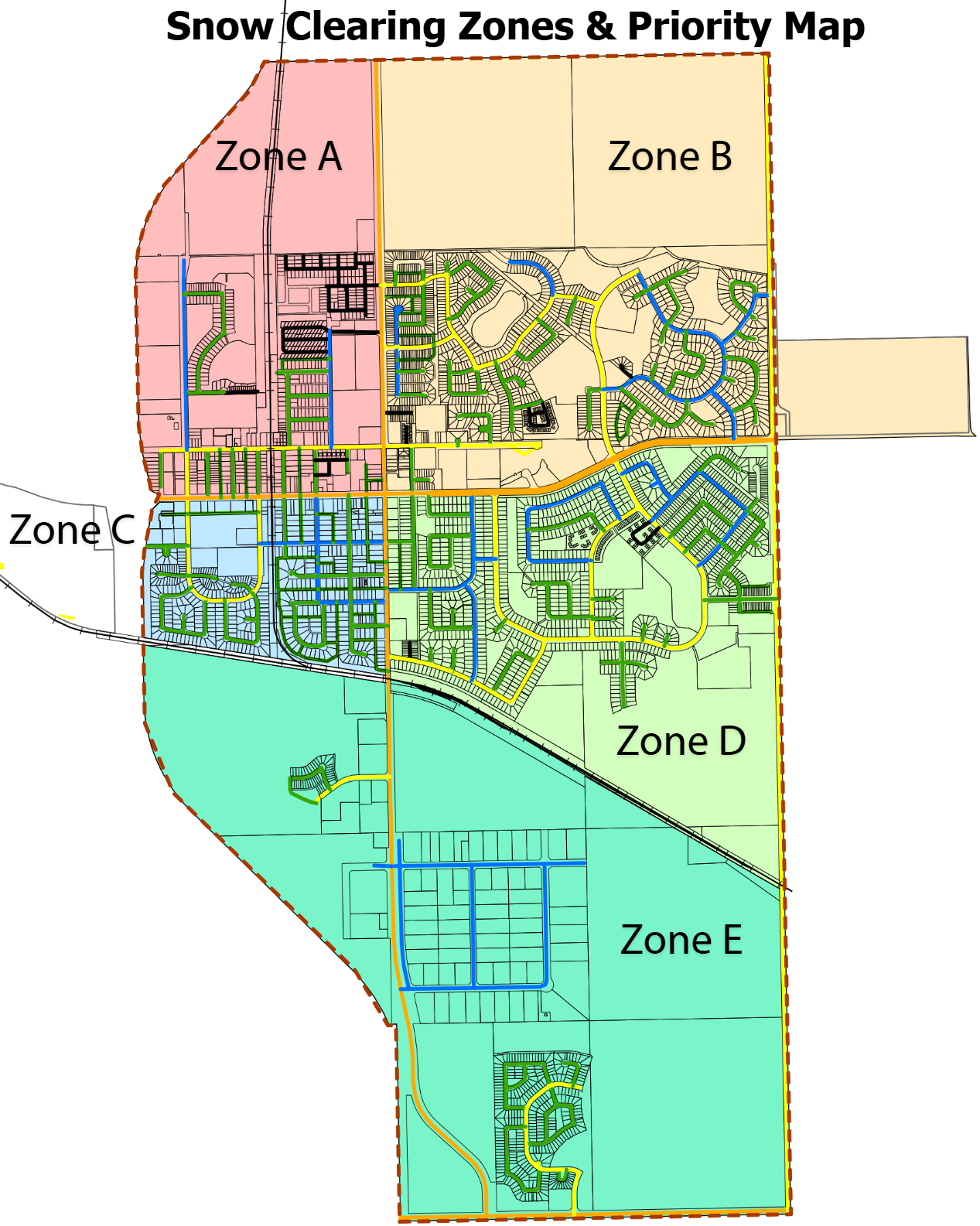 Priority 1 – Main Roads and Priority 2 - Arterial Roads, emergency routes (RCMP, Fire Station, EMS) will be plowed and Town facility parking lots |