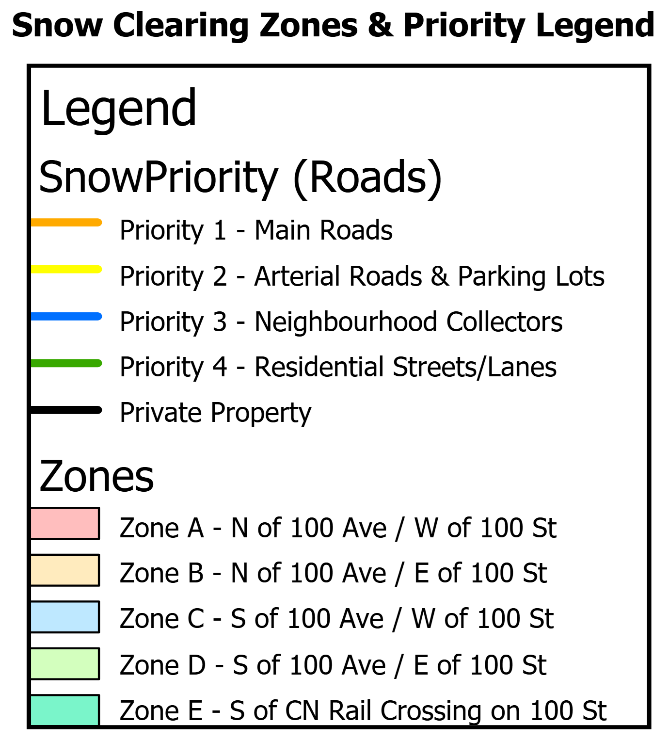Consists of 100 Street and 100 Avenue. Trails and sidewalks adjacent to Town owned properties will be cleared concurrently within this priority level while using specific equipment. Municipal parking lots will be cleared and snow pushed into piles which will be removed after the snow event and once all other priorities have been completed or as time permits.